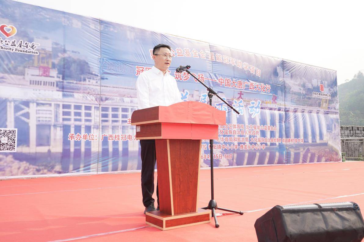 广西桂冠电力股份有限公司党委副书记、董事、工会主席蔡爽发言中提到:中国大唐与星能公益基金会第三次携手举办“奥运冠军进校园”活动。并向远道而来、传递榜样力量的奥运冠军和教练员们致以最热烈的欢迎与诚挚感谢,本次活动是以跨越山海的情谊为孩子们照亮梦想、播撒希望。